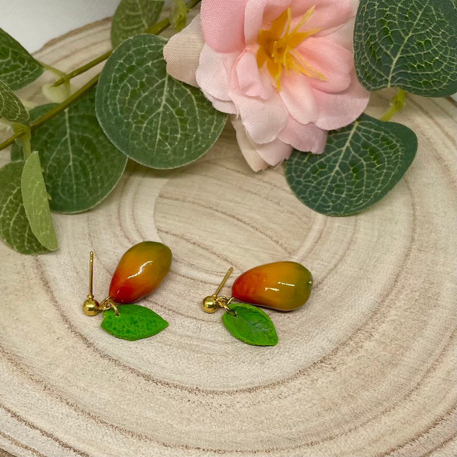 100% håndlavede mango frugter med tilhørende blade på forgyldte ørestikker af bly- og nikkelfri stål.